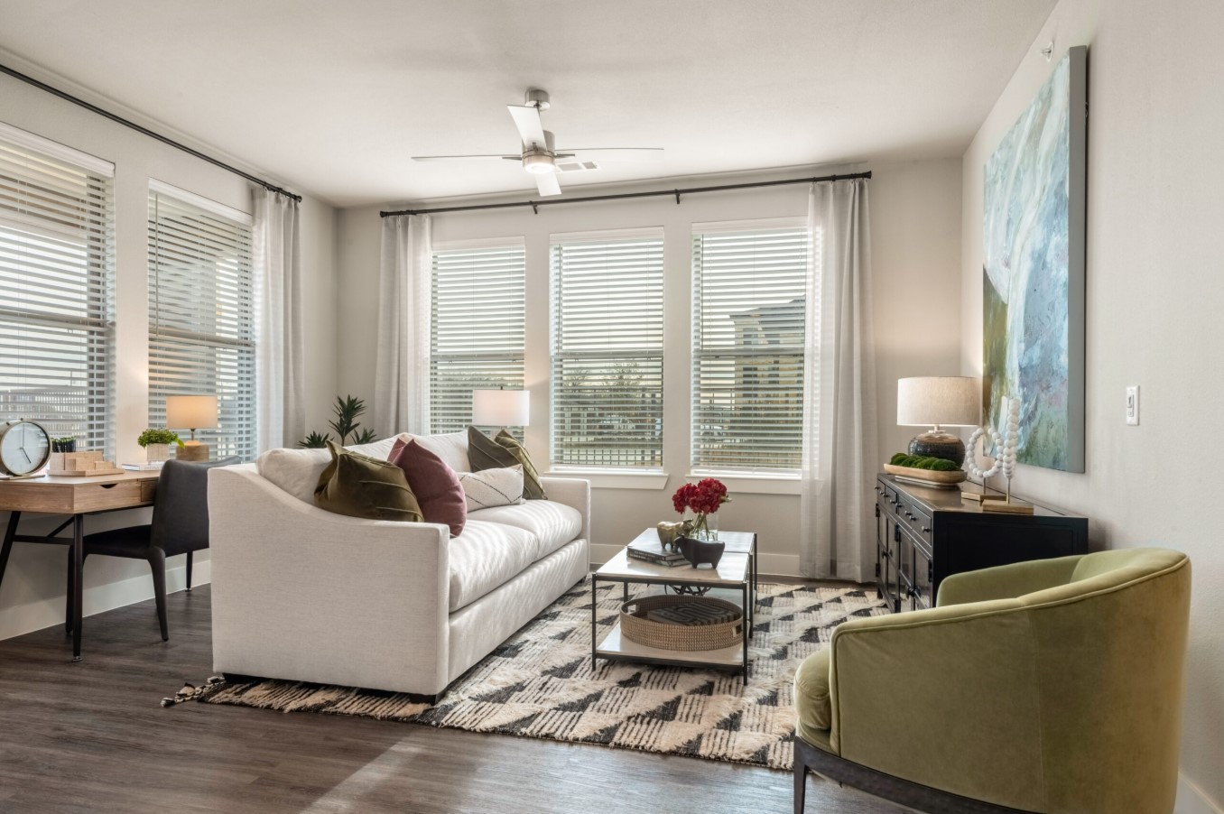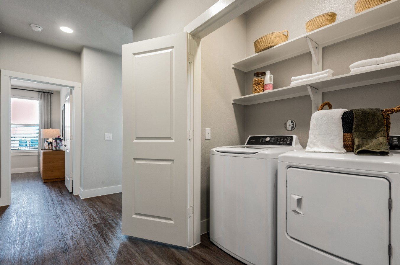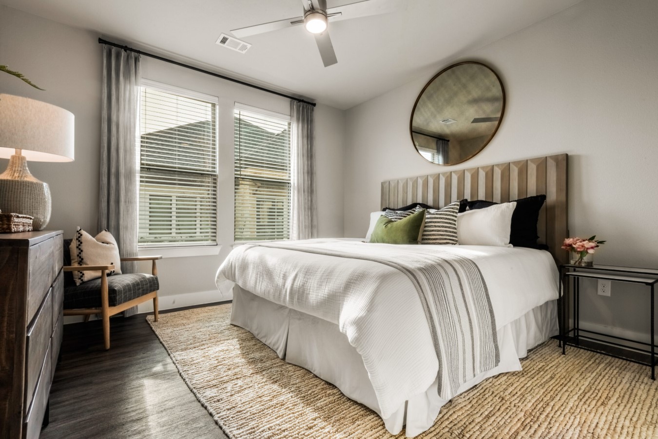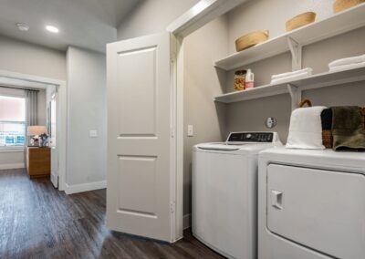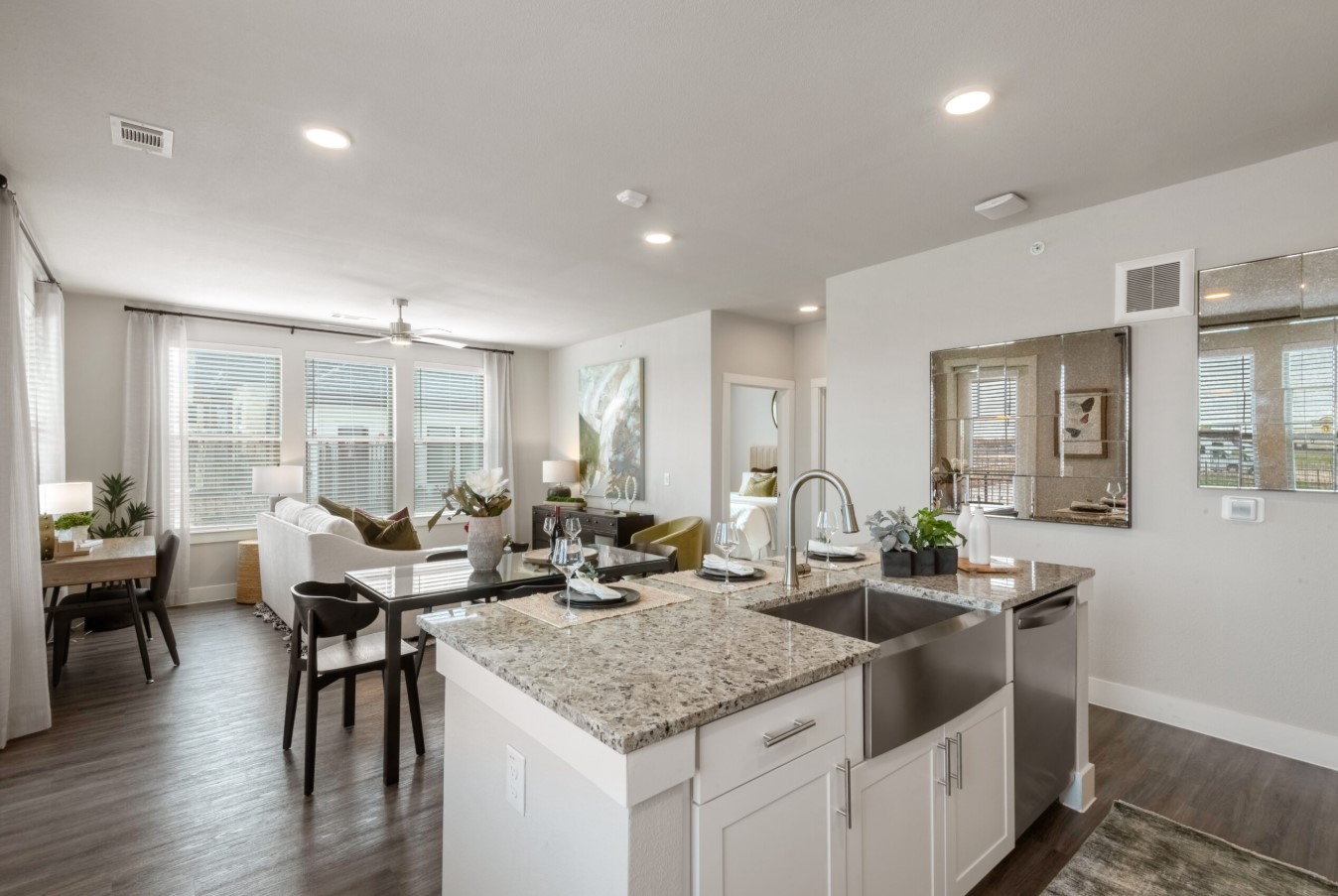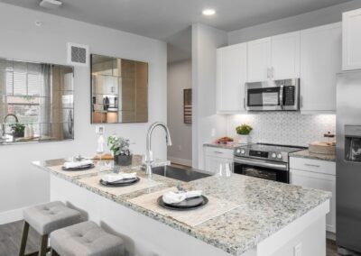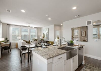 The apartments themselves are a masterpiece of modern design. Each home features minimum nine-foot ceilings that create an airy, expansive atmosphere, gourmet kitchens with custom shaker-style cabinetry and granite countertops, and luxury vinyl plank flooring for a sleek, contemporary feel. We specifically want to highlight the availability of private yards and private garages, offering the privacy and convenience typically reserved for custom homes. With farmhouse undermount sinks and WiFi-enabled thermostats, these thoughtfully designed layouts provide both comfort and elite functionality.