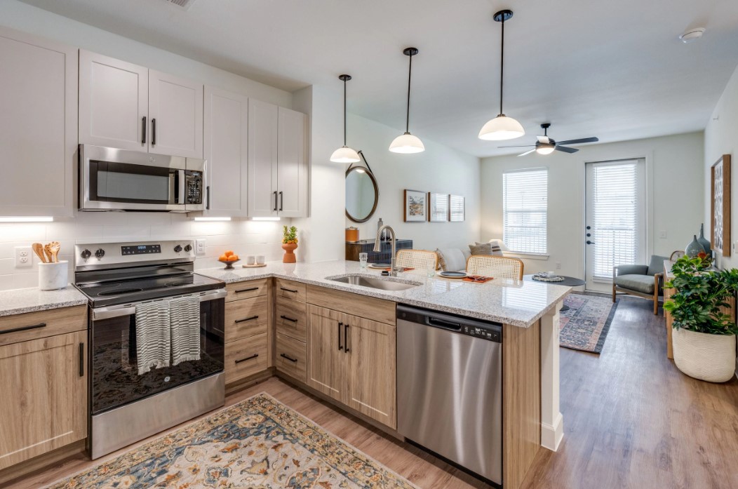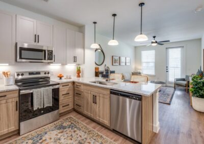 - Chef-Inspired Kitchens: Outfitted with elegant granite countertops, custom cabinetry with under-cabinet lighting, and a full stainless steel appliance package.